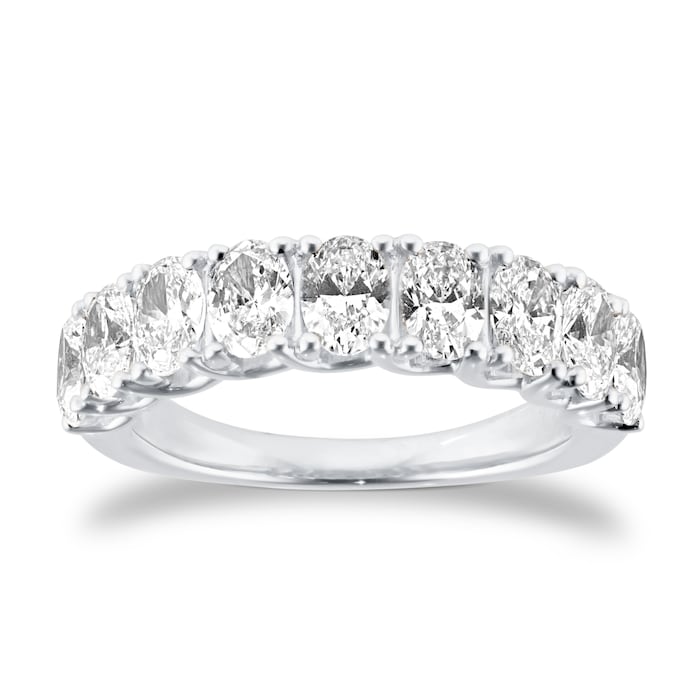 This platinum half eternity ring features nine oval cut lab-grown diamonds with a total weight of 2.00ct. The elongated shape of each stone adds graceful dimension to the band, enhancing its visual flow and brilliance.