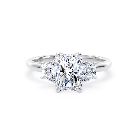 - Radiant cut centre stone framed by trapezoid side diamonds