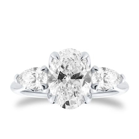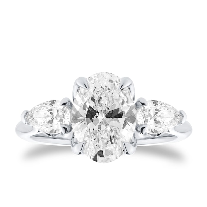 This platinum engagement ring features a 2.00ct oval cut lab-grown diamond at its centre, certified by the International Gemological Institute. Two pear cut side stones complete the composition, bringing the total diamond weight to 2.66ct.