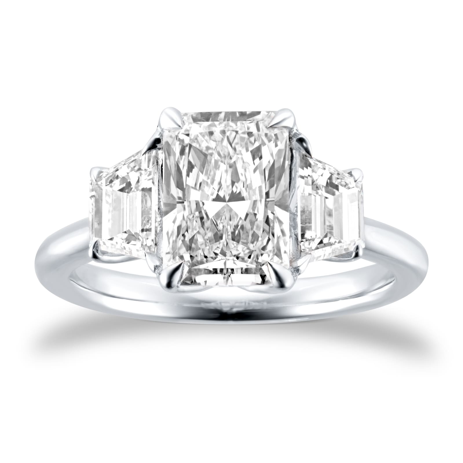 This platinum engagement ring features a 2.00ct radiant cut lab-grown diamond at its centre, certified by the International Gemological Institute. Two trapezoid cut side stones complete the composition, bringing the total diamond weight to 2.70ct.