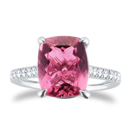 Set in platinum, this cushion cut pink tourmaline and brilliant cut diamond ring, with a total diamond weight of 0.20cts has outstanding beauty, clarity and sophistication.