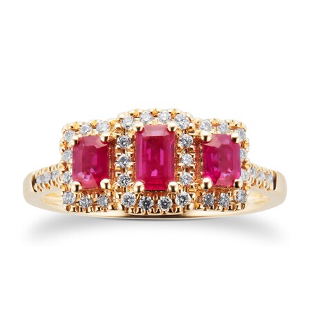Goldsmiths Ruby and Diamond Three Stone Ring in 9ct Yellow Gold - Ring Size P