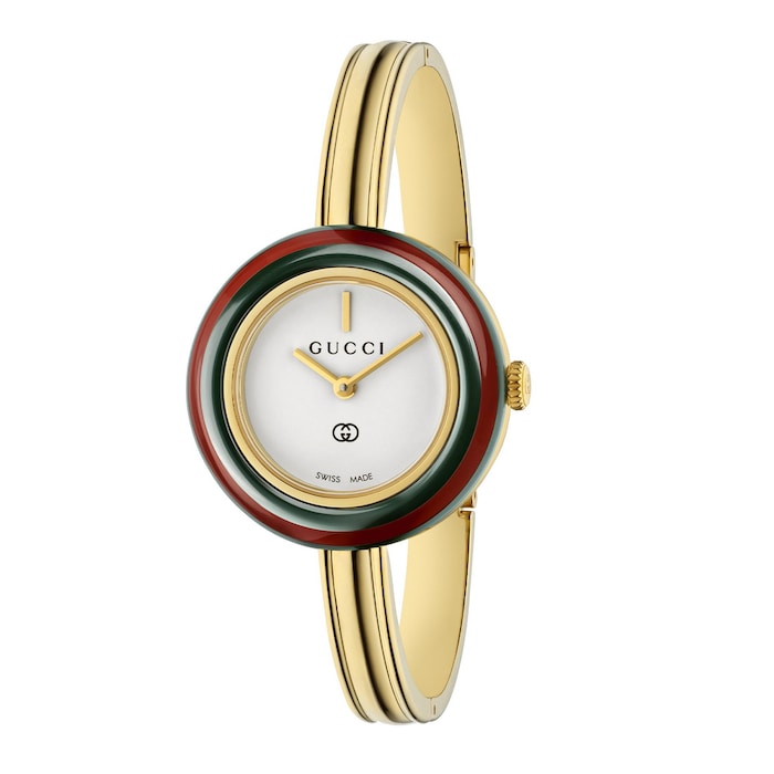 Gucci Play watch collection showcases a streamlined silhouette, featuring interchangeable ceramic bezels for a versatile styling. Powered by a quartz movement, the accessory is defined by a gold-toned bangle and a white dial enriched with signature symbols of the House.