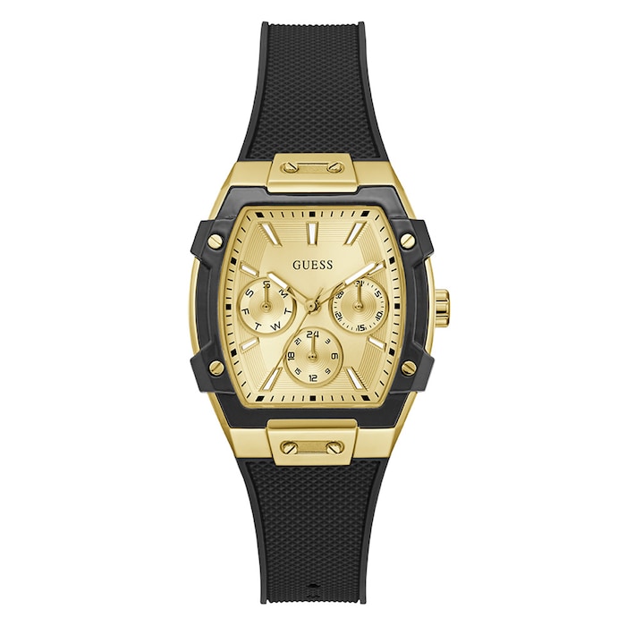 We’ve taken our signature silhouette and sized it down without losing any of the bold details you love. Meet the newest evolution of our Signature Icon: a 35 mm x 42 mm case crafted for an effortless, bold look. Sporty and chic, this style features a champagne sunray multi-function dial and gold tone case with an eco-touch of a black bio-based nylon overlay and a textured black silicone strap.