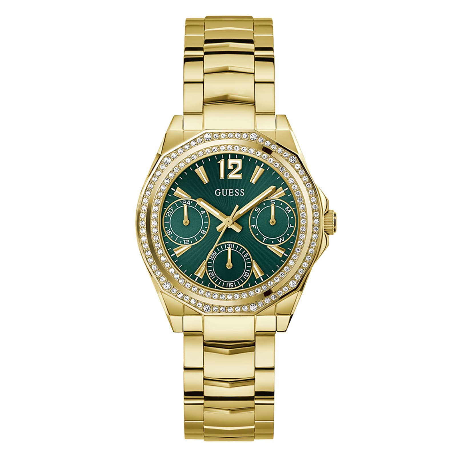 Put on the ritz with this show-stopping multi-function bracelet that's pure luxury in motion. Featuring a 36 mm round gold tone recycled steel case and bracelet. The rich green sunray dial provides multi-function capabilities while the double crystal bezel creates a dazzling frame that ensures you'll command attention wherever you go. Powered by quartz analog movement with 50 meters water resistance, this isn't just a watch—it's a statement piece for the woman who demands the very best and wants both glamour and performance.