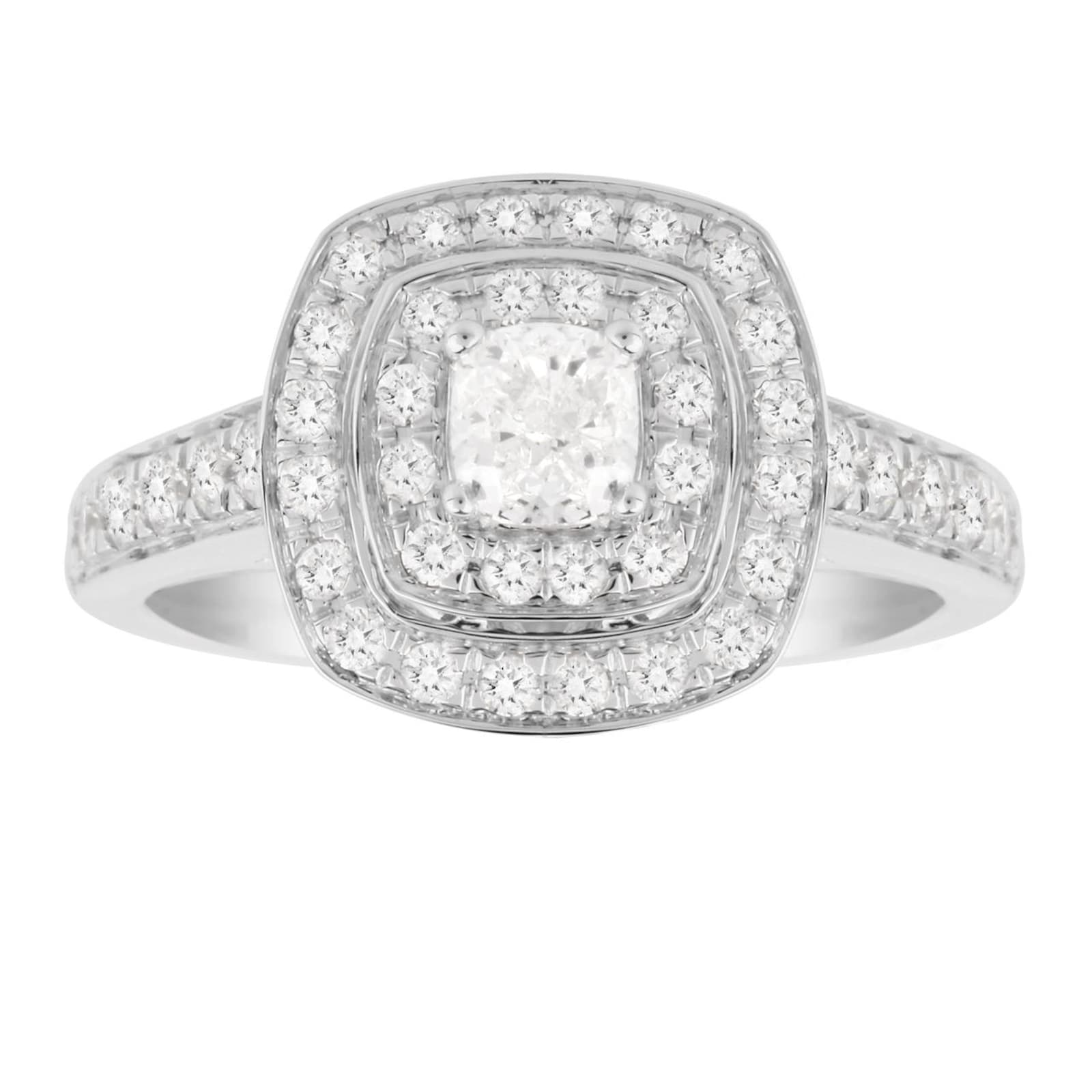 Presented on an 18ct white gold setting, the central cushion cut diamond is framed by a double halo of smaller yet equally as vibrant diamonds for a brilliant shine.