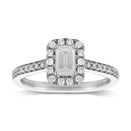 With 0.90 total carat weight, a central emerald cut diamond is framed by a glistening halo of smaller diamonds.
