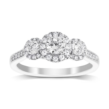 With 0.80 total carat weight, three brilliant cut, central diamonds sit elegantly on an 18ct white gold band, each surrounded by a halo of radiant diamonds.