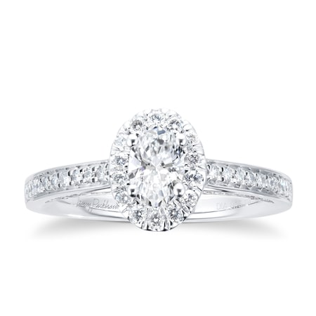 With 0.75 carat total weight, an oval cut diamond Is framed by a halo of smaller diamonds for a modern yet timeless design.
