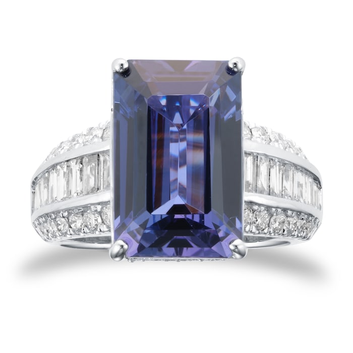This cocktail ring showcases a round brilliant cut tanzanite, its rich hue complemented by 1.47ct of diamonds. The diamonds, GIA certified and graded I1 for clarity and H for colour, are delicately set to enhance the central stone’s vibrancy.