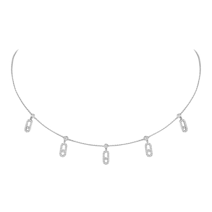 Give into temptation with the Move Uno drop pendant diamond necklace in white gold. It is made of 18 carat white gold and consists of a fine chain bearing 5 radiant Move Uno diamond charms. An ode to the light and radiance of diamonds, its suppleness and the movement that defines it is irresistible. Featuring a carabiner clasp with sliding system, you can wear it as a choker or choker necklace.