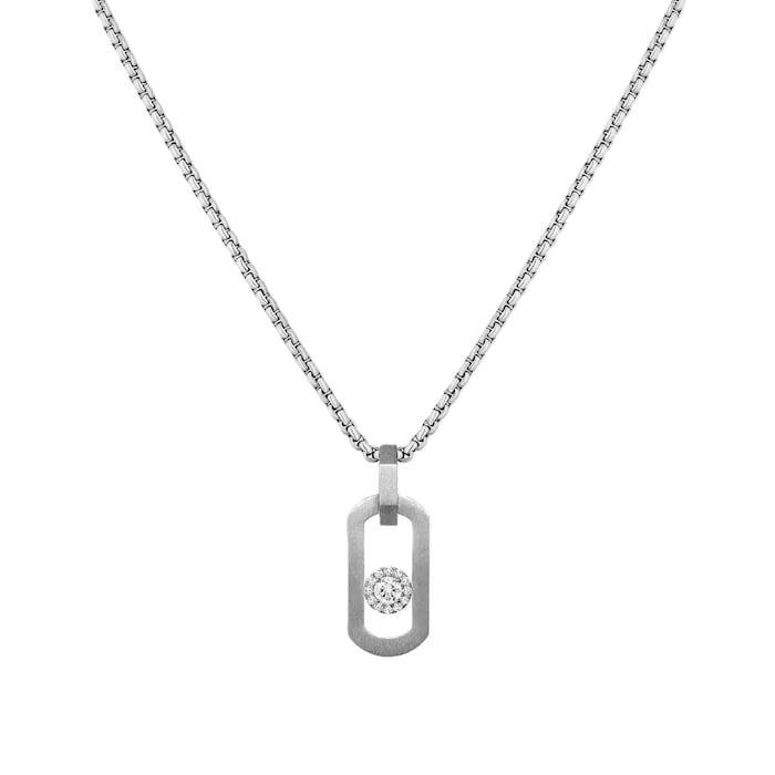 So Move is adorned in titanium and given a masculine edge. Valérie Messika has created a statement piece in natural titanium and diamonds. The iconic Move is transformed into an XXL, urban-chic pendant. This pendant necklace for men features a moving diamond in the center, enhanced by a halo setting for even more sparkle. The strength of the brushed metal contrasts with the sparkle of the stones, creating a piece that is both raw and contemporary. The So Move Titane pendant is the ultimate accessory for anyone who wants to challenge convention.