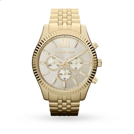 This Michael Kors Mens Lexington watch features a stunning 45mm stainless steel case with scratch resistant Mineral glass and a beautiful Champagne coloured dial showcasing Baton hour markers and protected by a fluted set bezel.