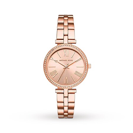 This Michael Kors Ladies Maci watch showcases a beautiful 34mm stainless steel case with scratch resistant Mineral glass and a stunning Rose coloured dial featuring Arabic numeral & Baton hour markers and protected by a fixed set bezel.