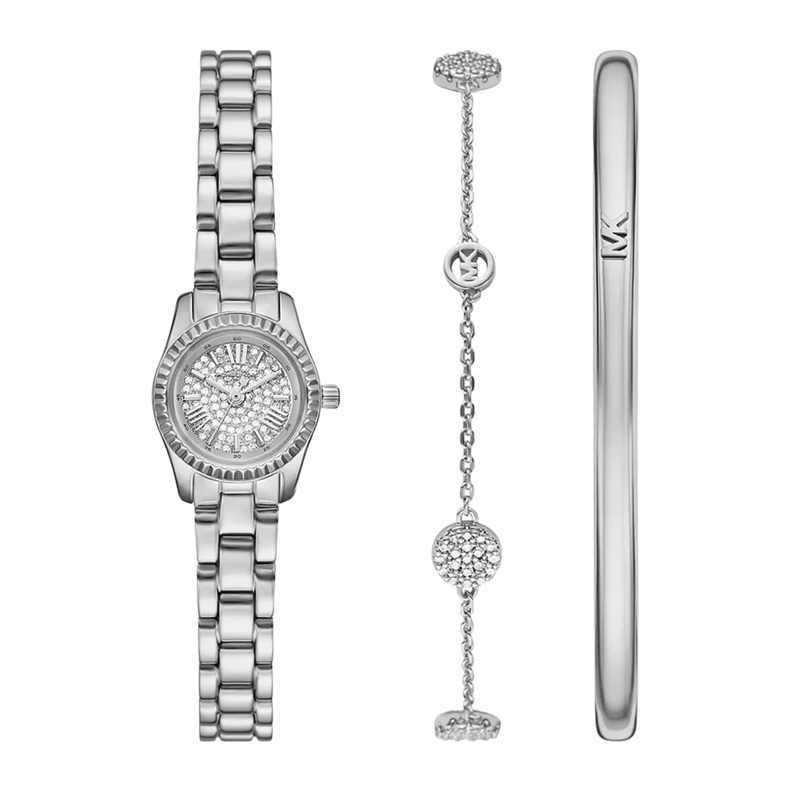 When it comes to gifting, more is definitely more. The mini timepiece in this set is crafted from stainless steel and features a dial illuminated by sparkling pavé stones. Complete with a sleek bangle and a pavé charm bracelet for added shine, this gift set is sure to please.