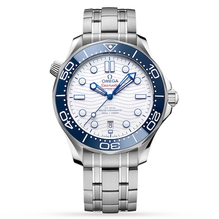 The 42.00 mm case is in stainless steel and is mounted with a blue ceramic bezel ring filled with a white enamel diving scale. There is also a polished white ceramic dial with laser-engraved waves, along with blued indexes and hands, and the famous Seamaster name highlighted in red.