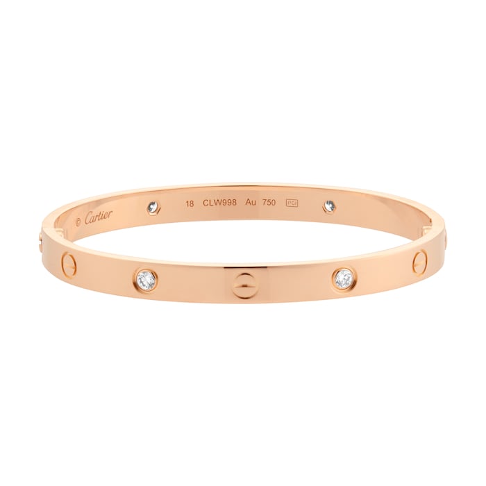 This Pre-Owned Cartier Love Bracelet in 18ct Rose Gold is from the Love collection. The bracelet includes 4 round brilliant cut diamonds circulating the outer edge, totalling 0.42ct features a single screw and hinge fitting.