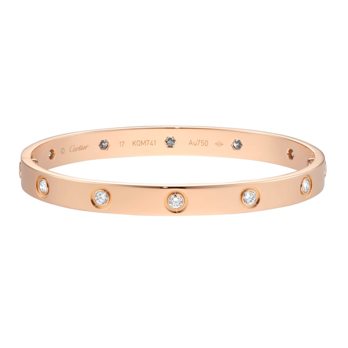 This Pre-Owned Cartier Love Bracelet in 18ct Rose Gold is from the Love collection. The bracelet includes 10 round brilliant cut diamonds circulating the outer edge, Totaling 0.96ct, features a single screw and hinge fitting.