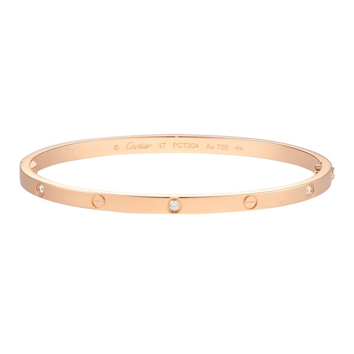 This Pre-Owned Cartier Love Bracelet in 18ct Rose Gold Half Diamond Bracelet is from the Love collection. This slimmer version of the classic Love bracelet features Cartier's iconic screw motif design alternating with 6 round brilliant cut diamonds totalling approximately 0.15ct and a single screw and hinge fastening. Measuring 3.65mm in width.