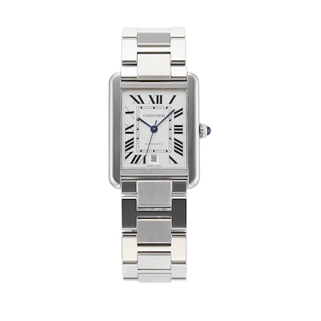 This Pre-Owned Cartier Tank Solo Extra-Large Model Men's Watch W5200028 features a 41mm stainless steel case fitted with a silver dial, sapphire crystal glass, and a date complication.