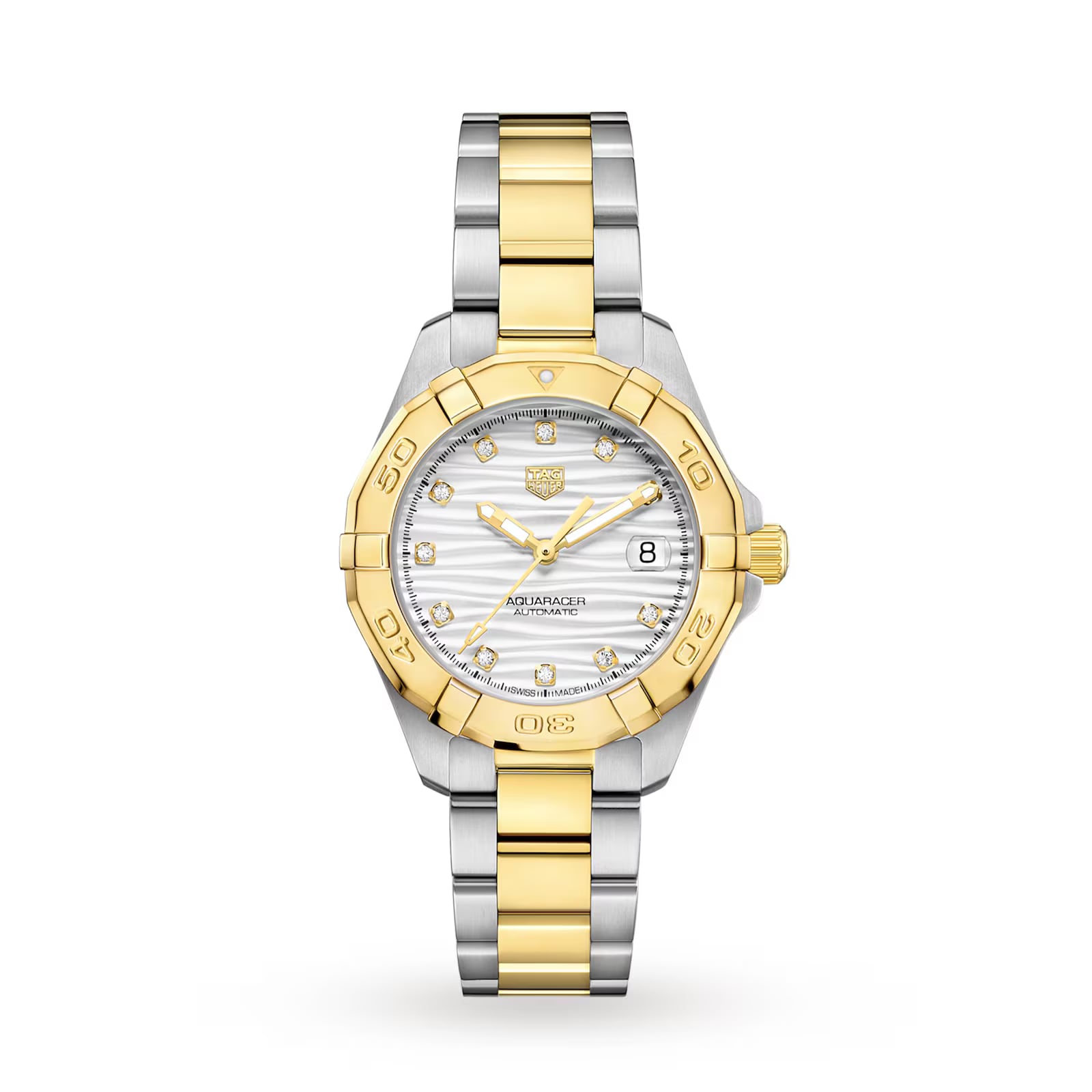 A professional silver-dial sports watch with plated yellow-gold (2N) details and 11 diamonds (0.107 CT) on its lacquered silver dial. Pure glamour, powered by the Calibre 9 automatic movement and including total water-resistance to 300 meters.