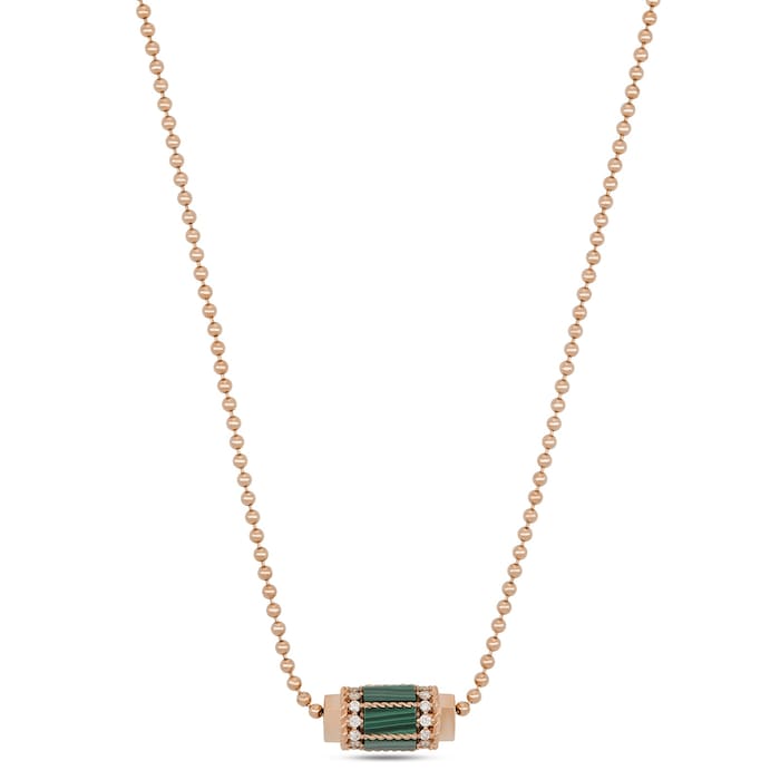 Malachite and diamonds add beauty to this cute necklace by Roberto Coin, featuring 18ct rose gold and all the uniqueness of a handmade creation.