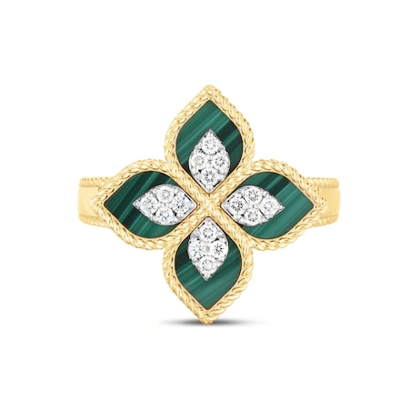 Malachite and diamonds dress up this flower ring by Roberto Coin, featuring 18ct yellow gold and the uniqueness of a handmade jewel.