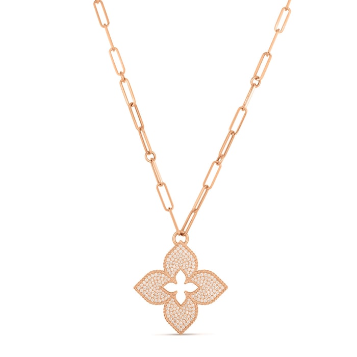 A fascinating full pave of diamonds gives uniqueness to this floral pendant by Roberto Coin, featuring 18ct rose gold and the uniqueness of a handmade jewel.