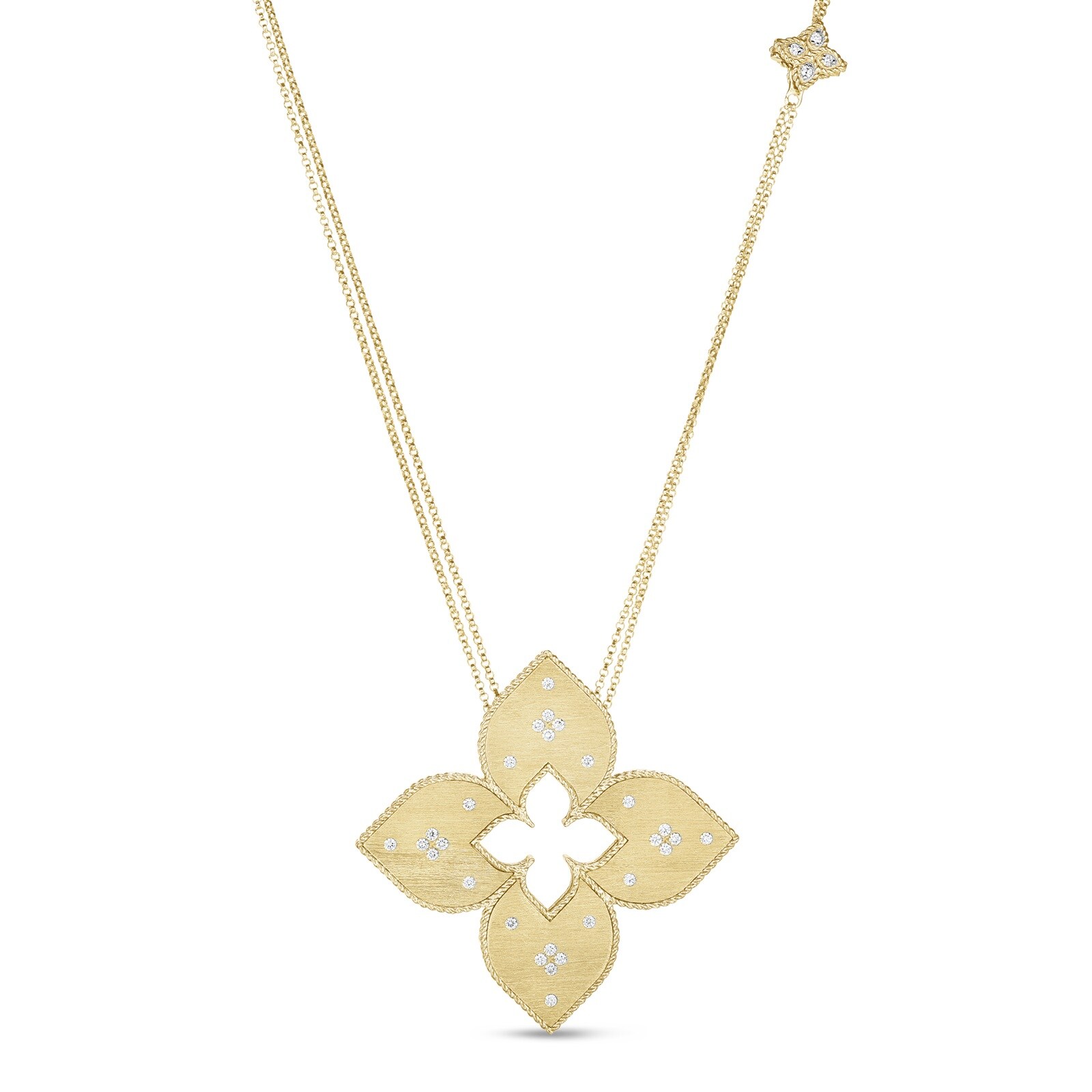 Diamonds add light to this stunning floral pendant by Roberto Coin, featuring 18ct yellow gold and the uniqueness of a handmade jewel.