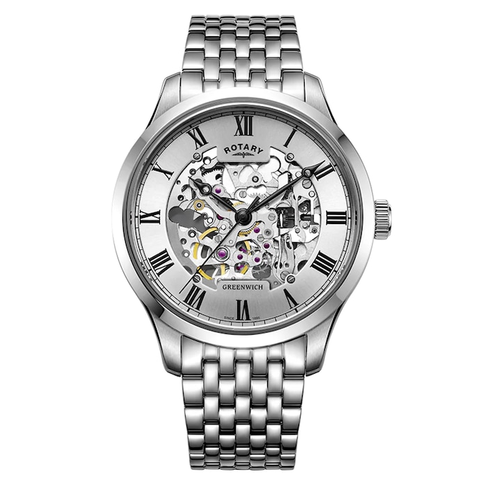 This Rotary Greenwich features a silver sunray outer dial with roman numerals surrounding the skeletonised centre of the automatic movement. This allows the wearer to observe the watchmaking at the heart of the watch and adds a dramatic finish.