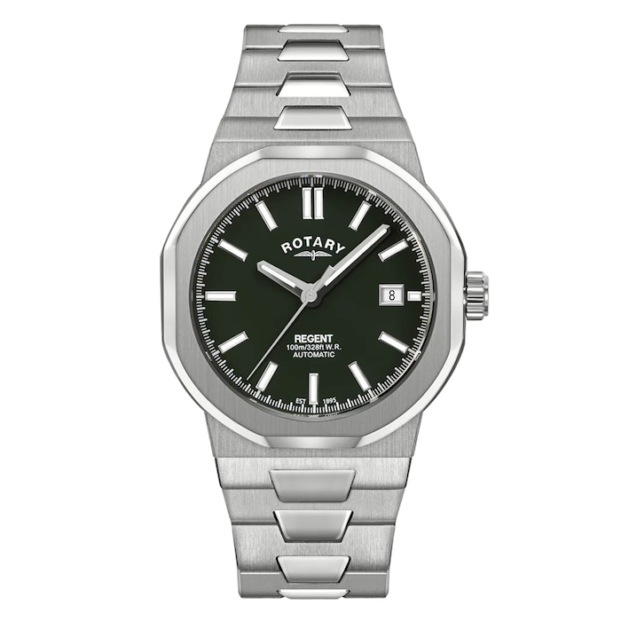 The Rotary Regent embraces a powerful design, featuring a 40mm multi-facetted stainless steel octagonal case and integrated multi-polish bracelet.