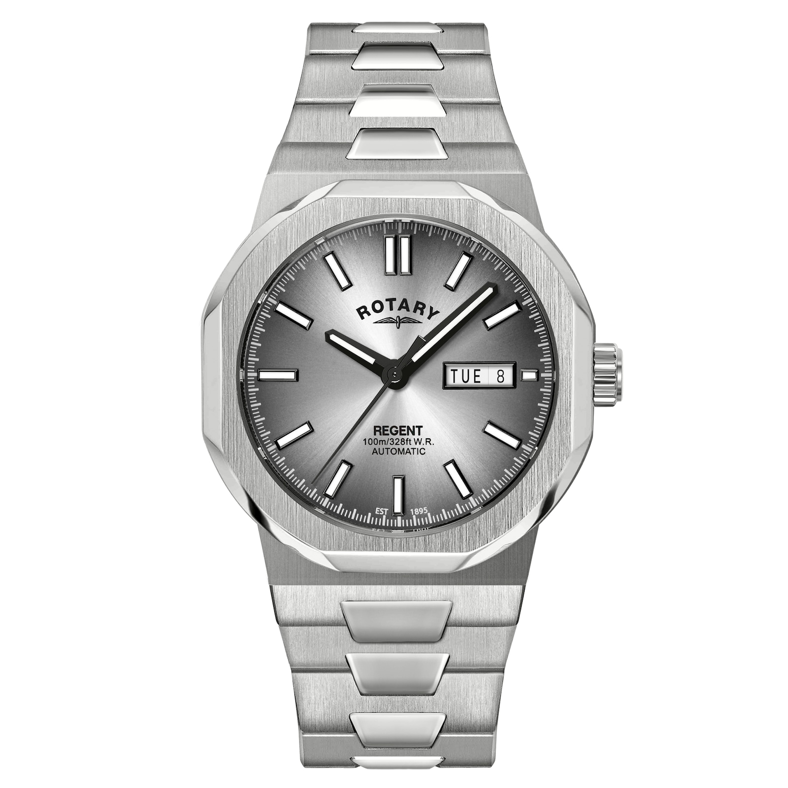 The Rotary Regent embraces a powerful design, featuring a 40mm multi-facetted stainless steel octagonal case and integrated multi-polish bracelet.