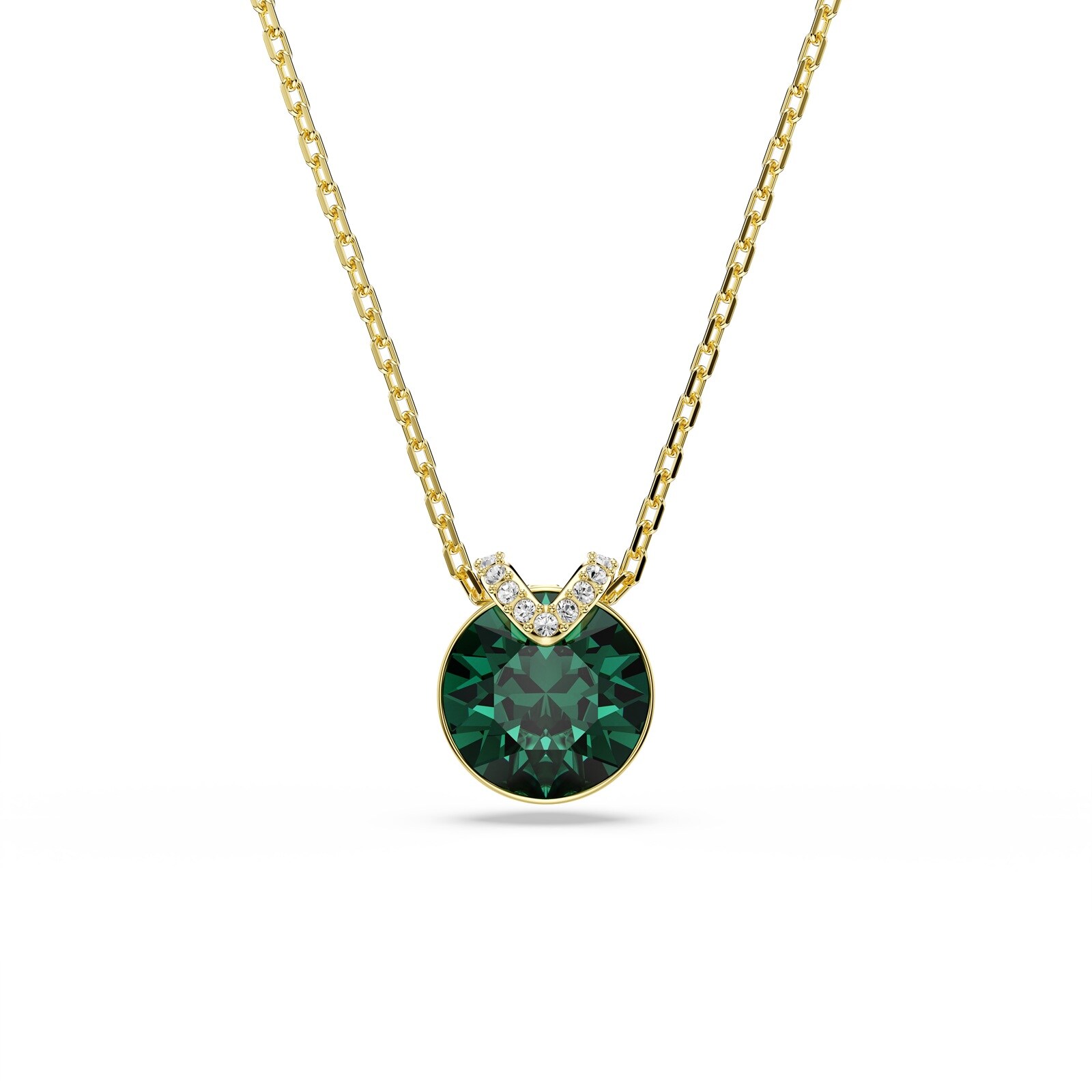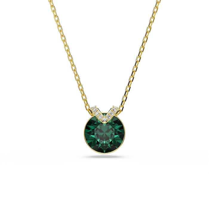 This mesmerising V-shape pendant has eye-catching appeal thanks to its central green crystal set in gold-tone plating. A flourish of shimmering pavé adds an extra layer of beauty, while the delicate chain exudes pure elegance. Wear it together with the matching earrings for a wondrous combination.