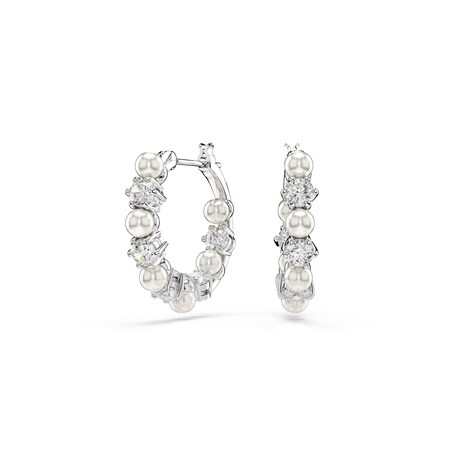These pierced Matrix earrings are a unique and contemporary twist on the classic hoop style. Each piece is rhodium plated and adorned with alternating Swarovski Zirconia and Swarovski Crystal Pearls. They're a statement of sophistication that will take any outfit from ordinary to outstanding.