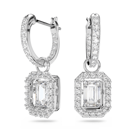 Elevate your everyday wardrobe with these exquisite drop earrings from the Una family. Made for pierced ears, this rhodium plated pair showcases octagon-cut dancing stones that are elegantly framed by pavé crystals. The versatile clear colourway makes them ready to be worn solo or paired with other colourful jewels for a curated finish.