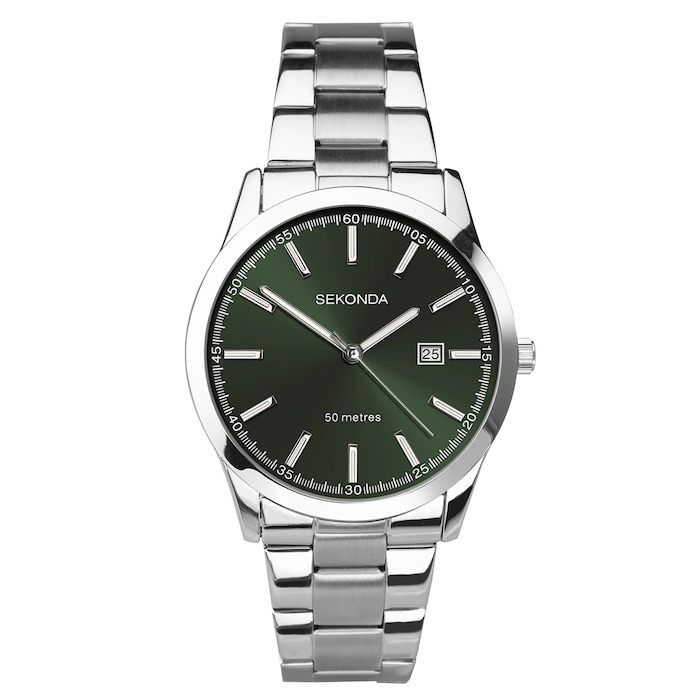 This watch features a round, silver coloured case housing a green sunray dial with a date display. Fastened with a stainless steel bracelet and is water resistant up to 50 metres.