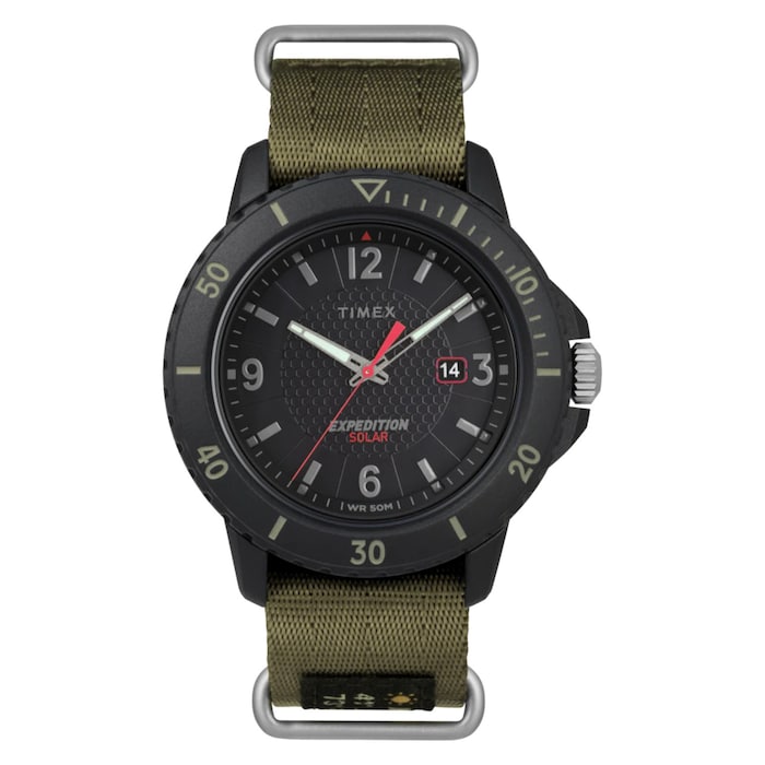 Charged by any light with a four-month power reserve, our Expedition Gallatin Solar is a sustainable, adventure-ready companion powered by natural energy. Inspired by the northern edge of the U.S. Rockies, this solar-powered watch is well-built for the outdoors with its green fabric double layer slip-thru strap, black resin case and black dial.