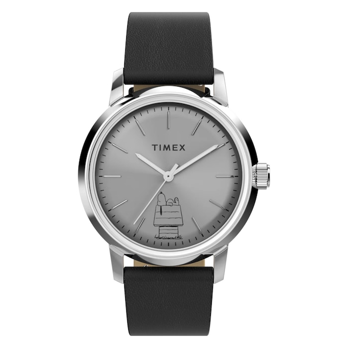 Celebrate 75 years of joy with our special Timex x Peanuts® watch collection, a heartfelt tribute to the imaginative genius of Charles Schulz. Designed for Peanuts fans of all ages, this playful iteration of our Marlin Automatic captures the fun and whimsy of Snoopy on its silver sunray dial. We’ve paired its charming design with a sleek 40mm stainless-steel case, luminant hands, a customized exhibition caseback with the Peanuts 75th anniversary logo, and a smooth grain black leather strap ethically sourced from the Leather Working Group (LWG).