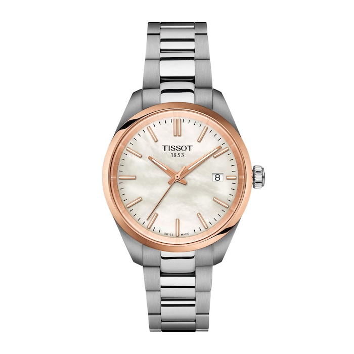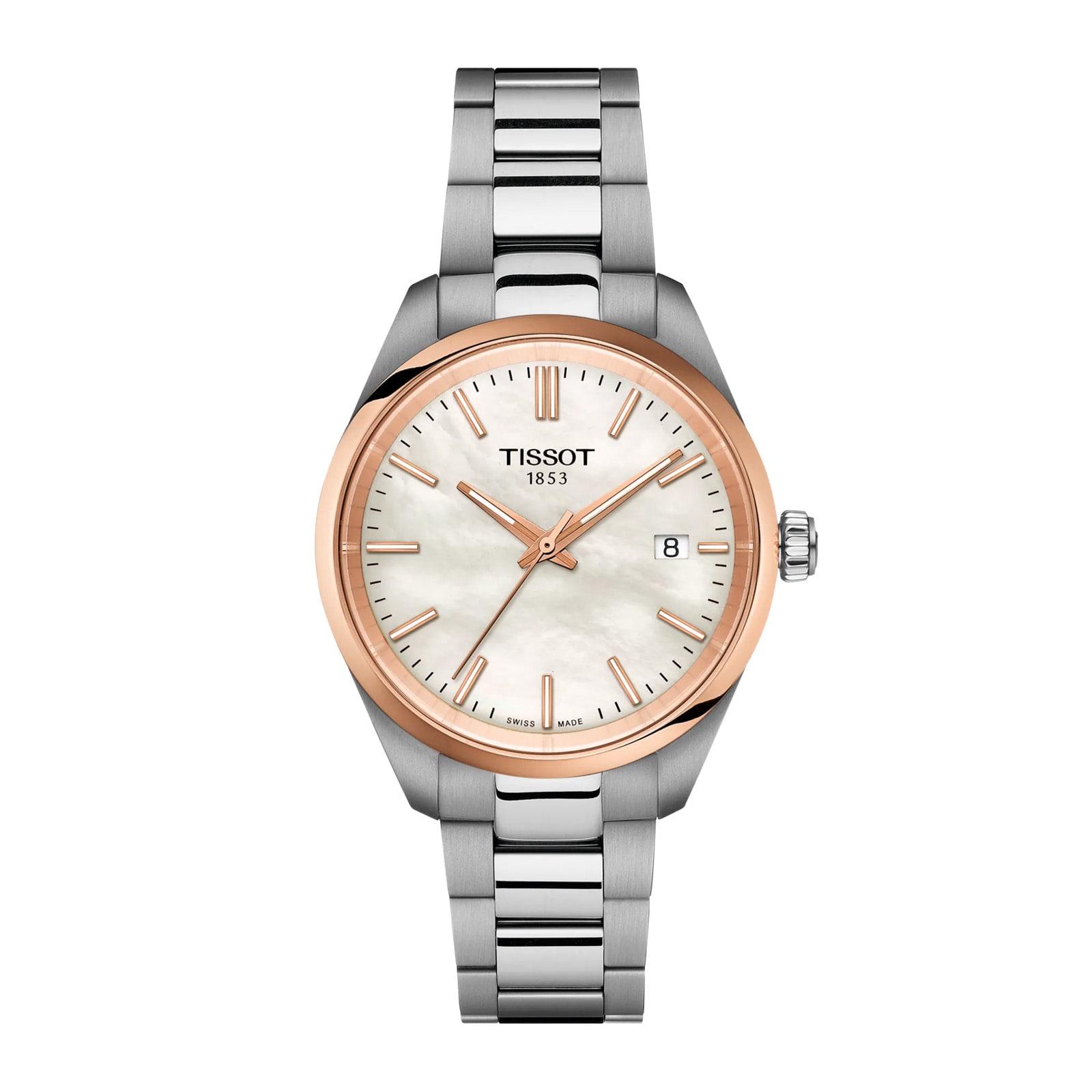 The best-selling Tissot PR 100 remains true to its name: precise (P), robust (R), and water-resistant to a pressure of 10 bar (100 m). This new feminine design offers an elegant and minimalist look. The SuperLuminova®-coated hands enable precise reading even in the dark. This Tissot PR 100 Quartz model features a 34mm stainless steel case with a rose gold PVD bezel, a mother of pearl dial and a classic stainless-steel bracelet for a subtle touch of chic that will make the difference.
