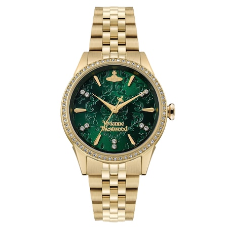 The Little Wallace watch is named after the infamous Wallace Collection in London, recalling Vivienne's admiration for art. The piece offers a green jacquard-etched dial, inspired by Jean-Honoré Fragonard’s 'The Swing', a masterpiece housed within the collection, complete with a gold-toned metal bracelet and Swarovski crystal details.