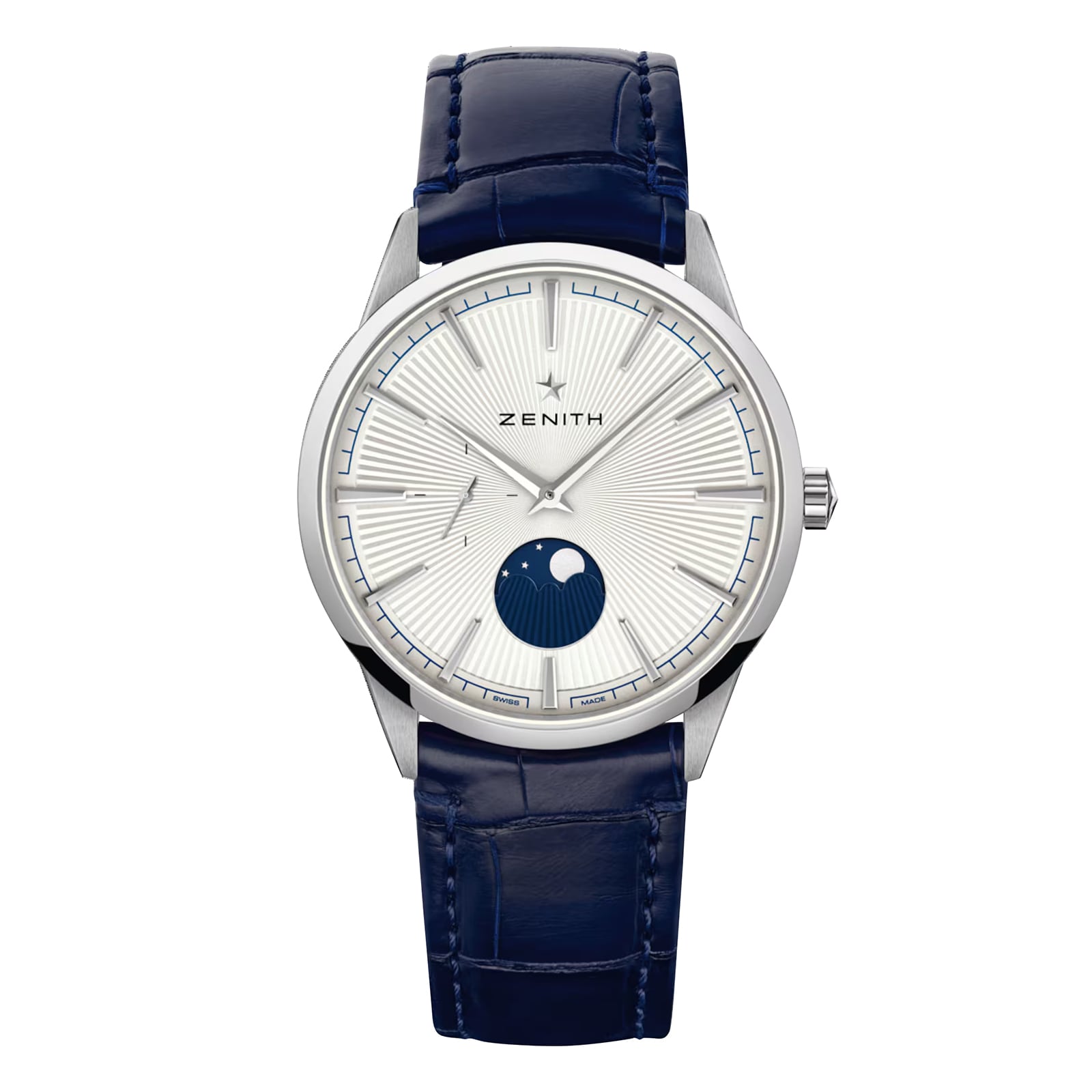 The ELITE Moonphase watch is made in 40.5mm steel case with a silver sunray-patterned dial, fitted on a blue alligator leather strap. Ultra-thin in its proportions and irreproachable in its performance, the ELITE manufacture calibre provides a power reserve of 50 hours with its automatic winding mechanism.