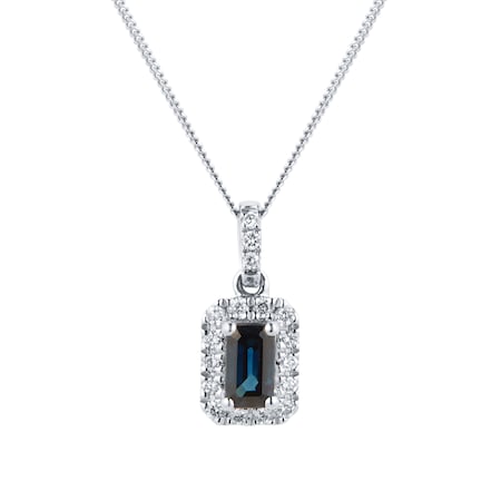 Reflecting the light from every angle, a stunning emerald cut sapphire is framed by a halo of diamonds and suspended from a delicate white gold chain, with a trio of glistening diamonds where the pendant joins the necklace.