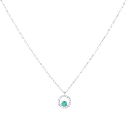 The round, 3mm emerald is the focal point of this beautiful pendant. Its rich hues are playfully surrounded by an open halo of sparkling brilliant cut diamonds, totalling 0.09ct, accentuating the emeralds beauty.