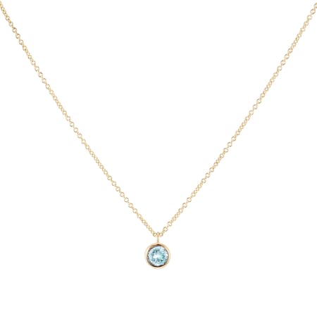 This birthstone pendant is truly captivating, with a central, round Aquamarine stone and suspended from a 45cm yellow gold chain.