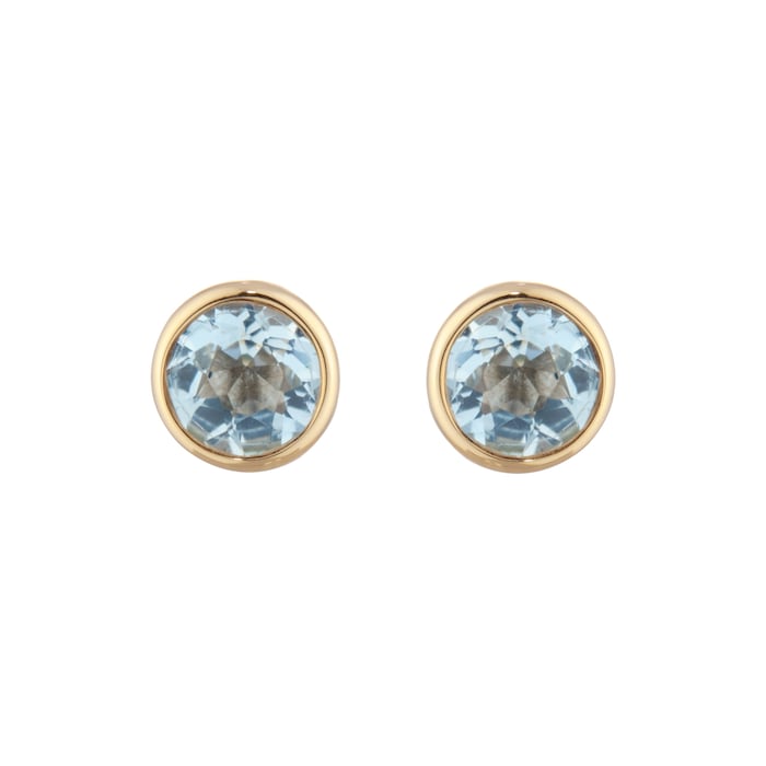 This pair of birthstone stud earrings are truly captivating, each with a central, round Aquamarine stone in a harmonious bezel setting.