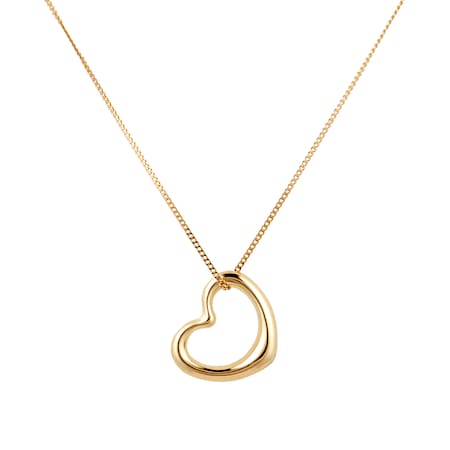 Embracing a simple, classic design, and warm gold tones, the open heart pendant is suspended delicately from a yellow gold chain spanning 45cm.