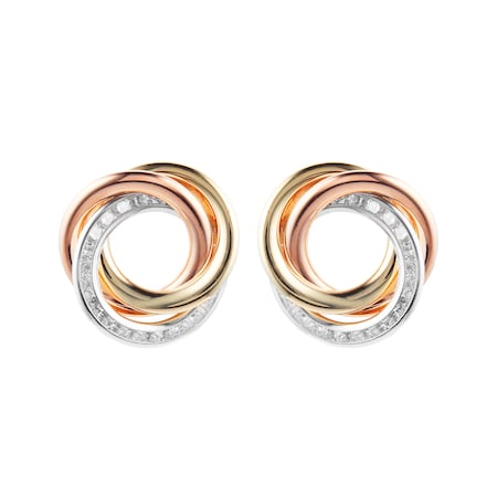 Made up of three interlocking circles, one white gold, one yellow gold, and one red gold, these earrings represent enduring love, then, now, and forever.