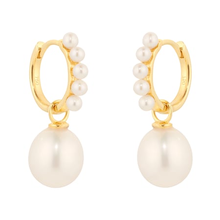 Set on a sleek 18ct yellow gold hoop lie a beautiful ensemble of freshwater pearls, with a single drop pearl adding a playful element of graceful movement.