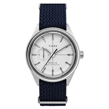 Our Marlin® Jet captures futuristic design ideals of the ‘60s with understated details and a 38mm brushed stainless-steel case that introduces a sleek new silhouette to our iconic Marlin line. However, its most defining feature is the domed crystal. Made from Hesalite—a refined form of acrylic favored for its clarity and ease of maintenance—the crystal covers the entire top surface of the watch case, enveloping the grooved bezel bearing the Marlin name and bringing captivating depth to the watch's retro-futuristic appearance. It blends seamlessly into the flat case sides, leaving only the lugs exposed. The case sides smoothly transition to a screwed-on exhibition case back that mirrors the crystal’s domed contour, enhancing the watch’s streamlined profile and space-age aesthetics. You’ll find a concentric circle pattern in three key locations on this timepiece: beneath the dome on the inner bezel, on the crown, and on the case back. The silver-white concave dial showcases a crosshair pattern punctuated with a 24-hour format sub-dial beside the 9 o’clock marker. Completing the look, we’ve paired the Marlin Jet with a blue woven perlon strap that introduces a subtle textural element to its clean design.