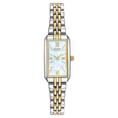 Perfectly complete any look with the elegance of this Citizen Eco-Drive Ladies' Classic. With a case size of 26mm and a two-tone stainless steel rectangle case and bracelet, this timepiece fits seamlessly on the wrist. The look is completed with a beautiful Mother-of-Pearl dial and gold-tone hands and markers. Additional features include water resistance and a jewellery clasp with push button release. Sustainably powered by any light with Citizen Eco-Drive technology - never needs a battery.